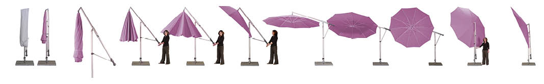 A kényelmes tekerőkar segítségével, a szerkezetbe integrált fogaskerekeken keresztül a napernyő könnyedén nyitható és zárható. Igény esetén a szerkezet motorosan is működtethető. A szerkezet elérhető kör, négyzet, téglalap, valamint különlegesebb kialakítású háromszög formában. A közbenső tartóoszlopon túl pedig lehetőség van excentrikus kialakításra.