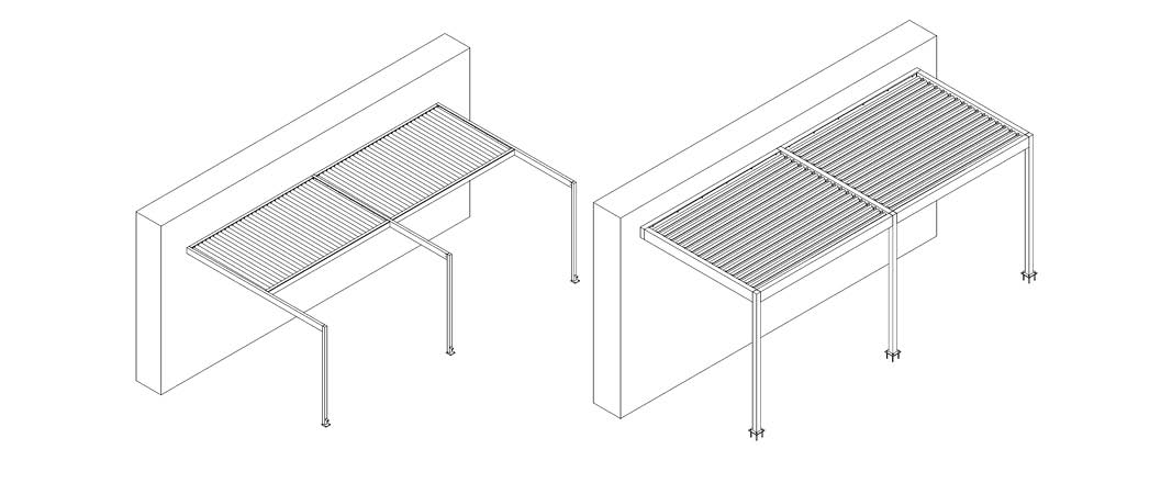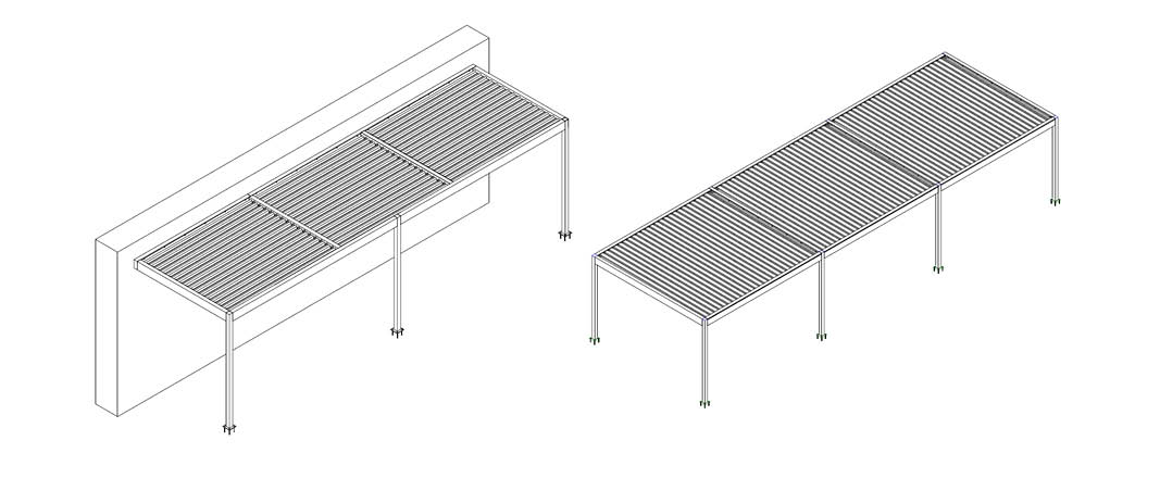 Esővédő alumínium lamellás pergoláink beépítésüket tekintve többféleképpen viszonyulhatnak az épülethez. A pergolarendszer megjelenhet az épülethez kapcsolódó, az épületszerkezetbe integrált, esetleg ún. „lebegő” tetőként, vagy az épülettől teljesen függetlenül álló pavilonként. Minden beépítési mód más-más lehetőséget teremt a vendéglátótér kültéri megnövelésére.