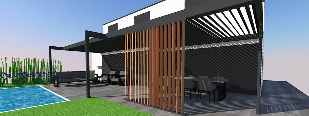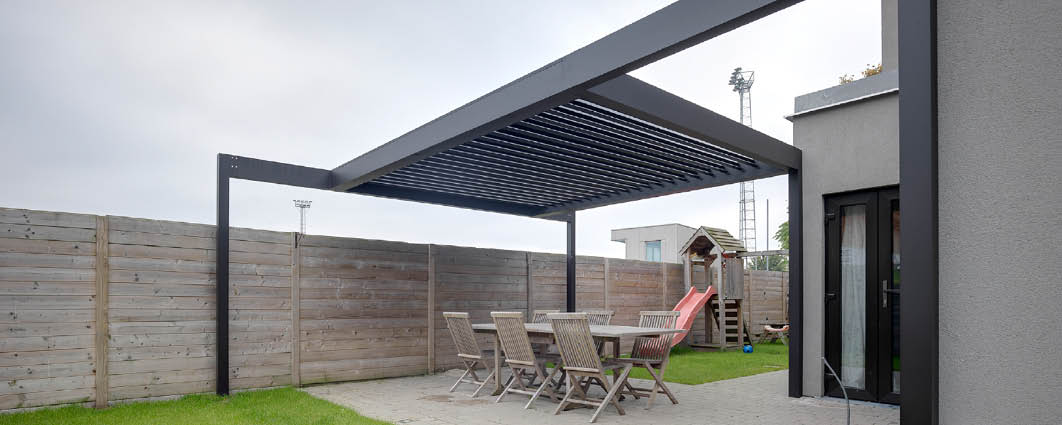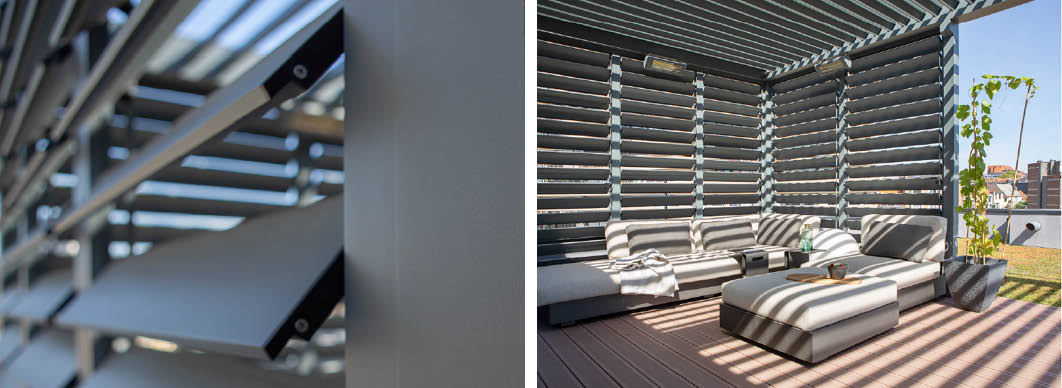 Roló telepítésére vízszintes síkban is lehetőség van. A lamellás pergolákat textil árnyékolókkal kombinálva elsősorban a fedett és nyitott terek arányát valamint a bejutó fény mennyiségét szabályozhatjuk. A pergola rendszer multifunkcionális térré alakítható, ahol mindenki a közérzetének megfelelően foglalhat helyet.