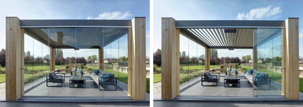 Ahogy korábban már említettük, a pergolarendszer fix, valamint eltolható üvegpanelekkel szerelten akár hűvös időszakban is használhatóvá válik.