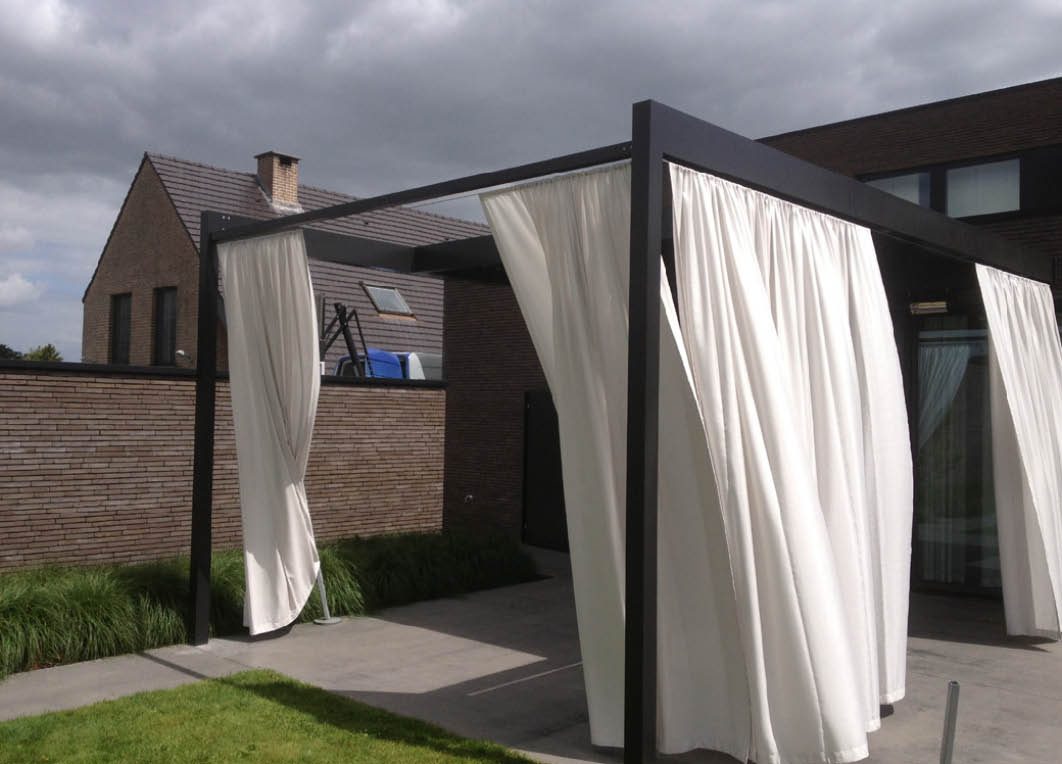 Esztétikus és egyedi megoldásként kültéri függönnyel is kombinálható a pergolarendszer.