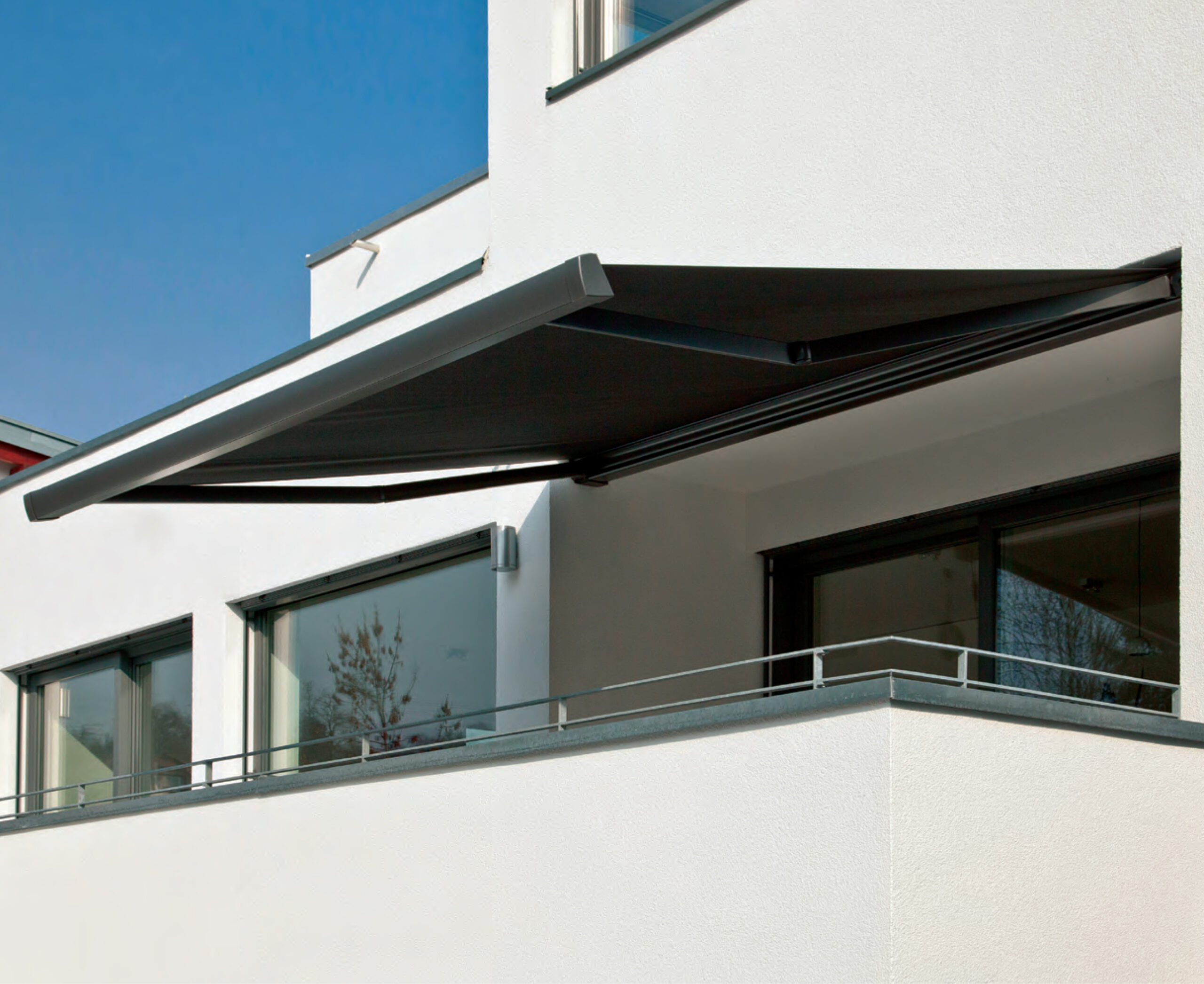 Csuklókaros napellenző, egyrészes zárt burkolattal, kézi tekerőkaros, vagy motoros mozgatással