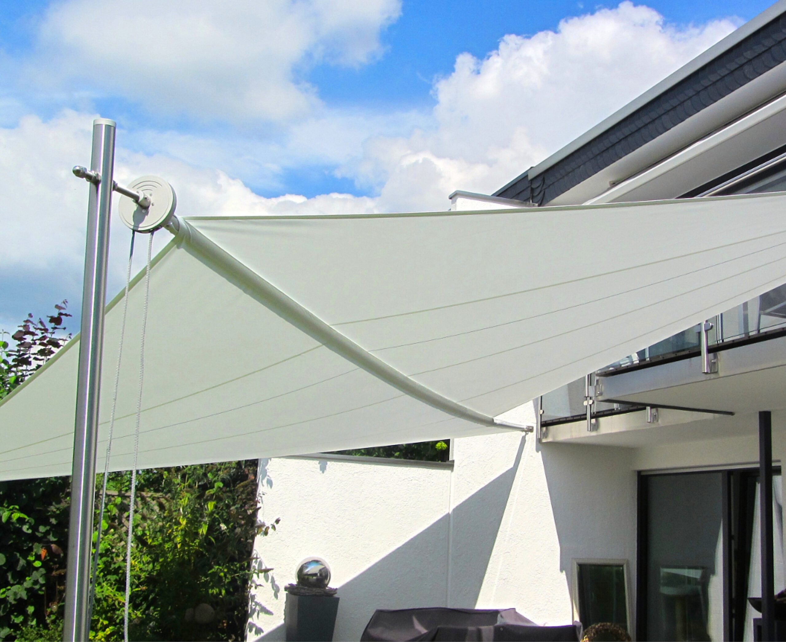 Kézi mozgatású napvitorla, átlós anyagtengellyel, két irányba történő anyagkihúzással