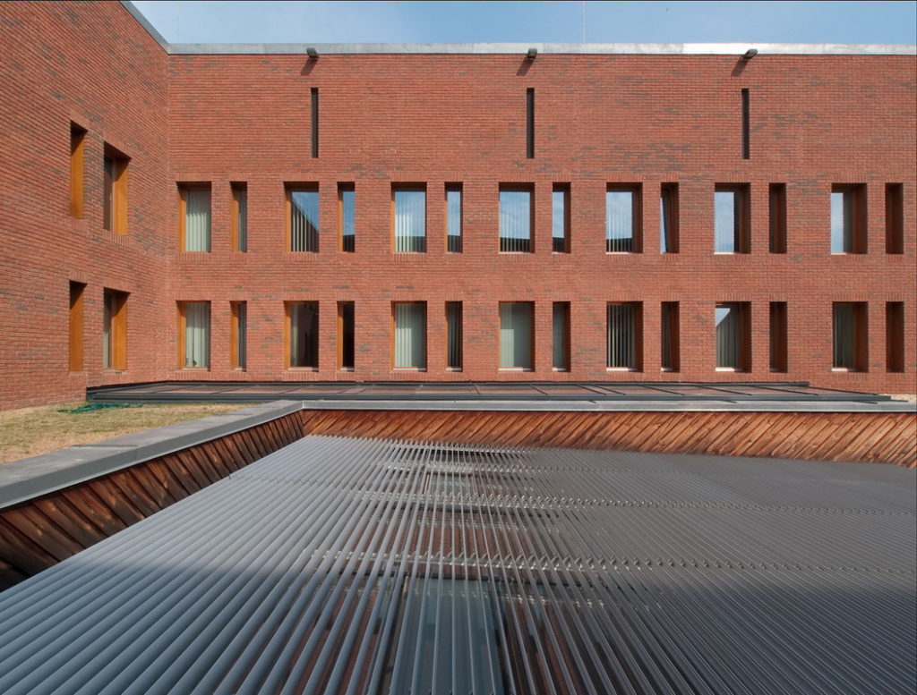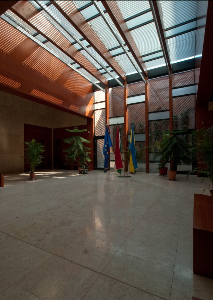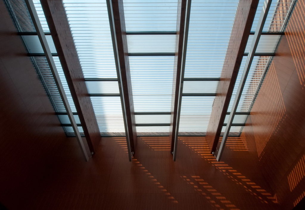 Az Ítélőtábla aulája feletti üvegtető árnyékolását motorosan mozgatható fix, de hossztengelyük mentén billenthető lamellás szerkezet biztosítja. szerkezet típusának megválasztásakor két fontos szempont érvényesült: mivel az üvegtető enyhén a belső udvar síkja alá van süllyesztve, az épületből is rá lehet látni. Emiatt a tervezési folyamat során arra törekedtünk, hogy minél egységesebb felületet mutasson az árnyékoló, vagyis a lehető legkevesebb osztás jelenjen meg rajta. Az alkalmazott szerkezetnél a lamellák hátsó, rejtett megfogási módja lehetővé teszi, hogy a lamellák a vezetősínek fölött fussanak. A keskeny, 75 mm széles lamellák ugyanakkor szépen illeszkednek mind a téglaburkolat, mind a felülvilágítót keretező faburkolat adta filigrán textúrához.