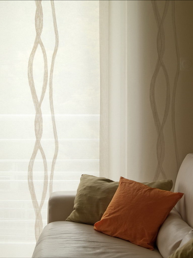 Az igényesen kialakított lakás belső téri árnyékolói a helyiségek színvilágának, hangulatának figyelembe vételével kerültek kiválasztásra. nappaliban elhelyezett, finom mintájú lapfüggöny visszafogott hátteret biztosít a letisztult formavilágú berendezésnek.