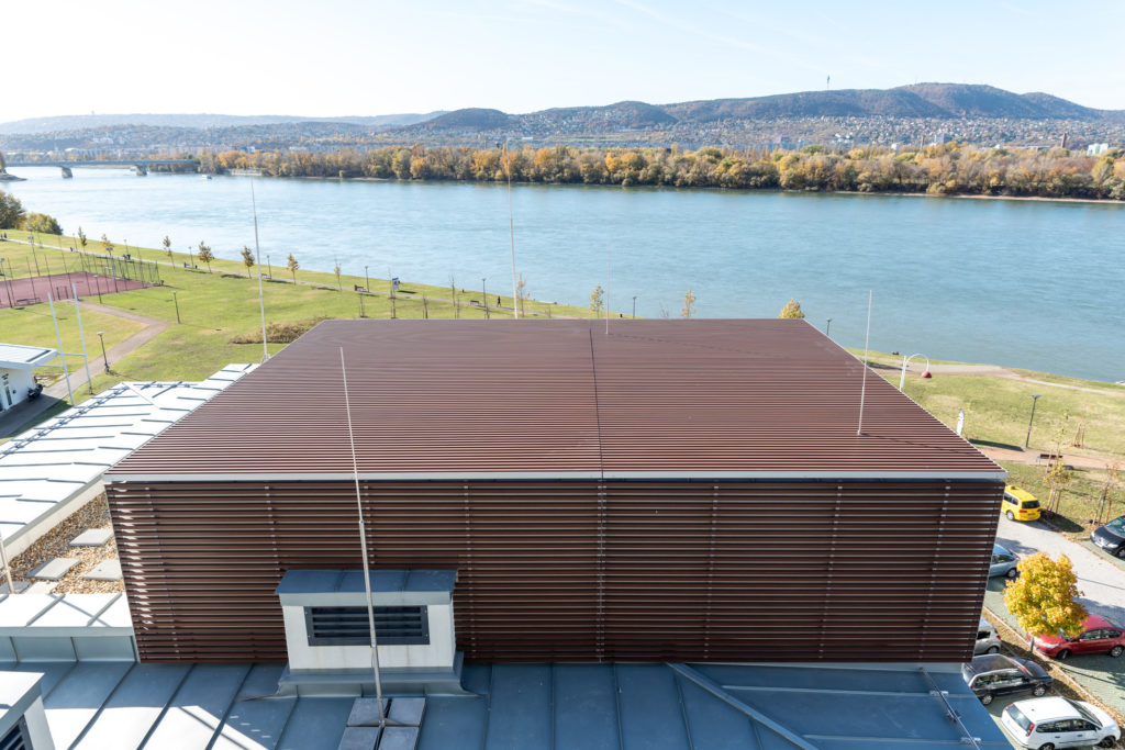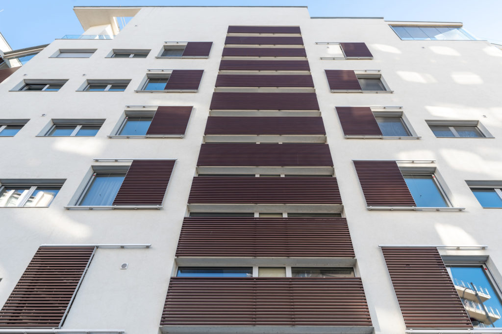 Az társasház homlokzatának meghatározó elemei a famintázatú, négyszög keresztmetszetű alumínium lamellás árnyékolók, amelyek fix és eltolható táblás kivitelben készültek. A fix szerkezetek különböző funkciót betöltve jelennek meg az épületen: mint árnyékoló, mellvédkorlát, gépészeti takarás és homlokzati díszítőelem.
