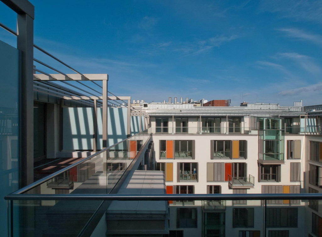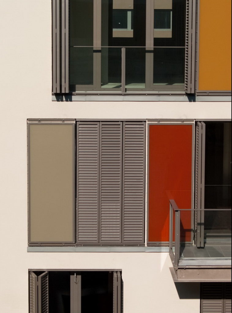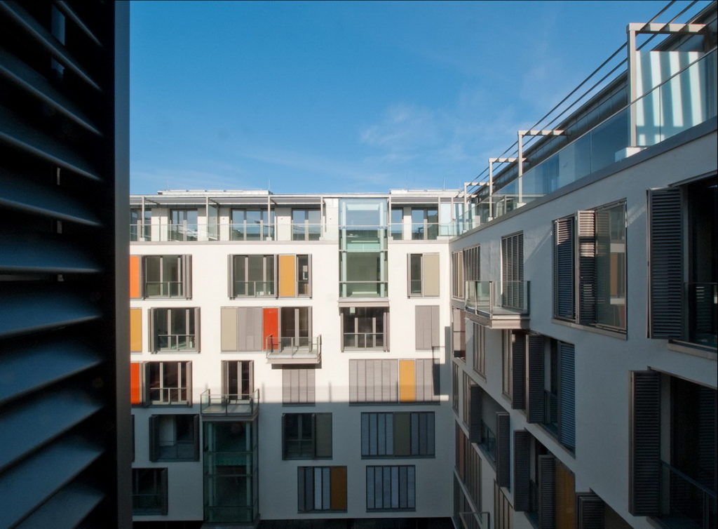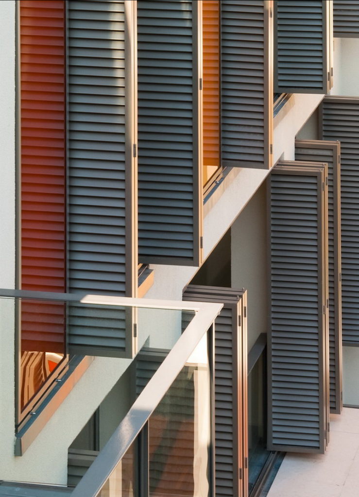 A patinás belvárosi palota felújítása során a tervezők a belső tér átalakítása mellett újrafogalmazták a belső udvari homlokzatokat is. világos, tágas udvarra néző lakások üvegfalai előtt elhelyezett, harmónika szerűen eltolható alumínium árnyékoló panelek és a nyílások közötti fix, színes üvegbetétes elemek révén izgalmas, állandóan változó homlokzati architektúra alakult ki. A gondos tervezés és a körültekintő szerkezetválasztás eredményeképpen a megvalósított rendszer az árnyékoláson és az esztétikai igényeken túl a belátásgátlás problémáját is kezeli, azt bizonyítva ezzel, hogy a jó megoldások legtöbbször a legegyszerűbbek.