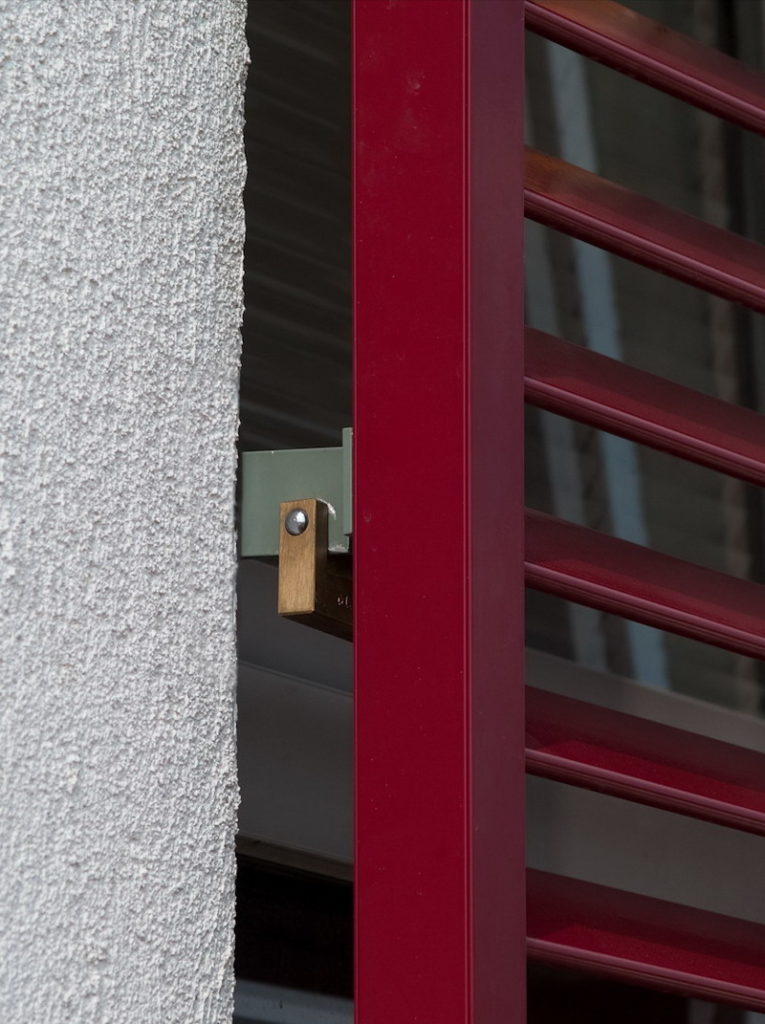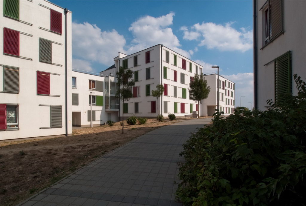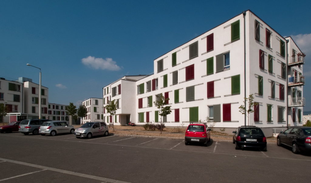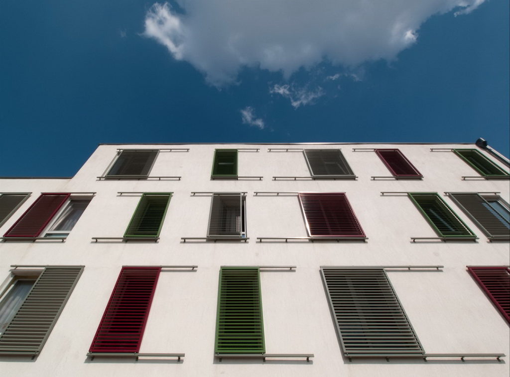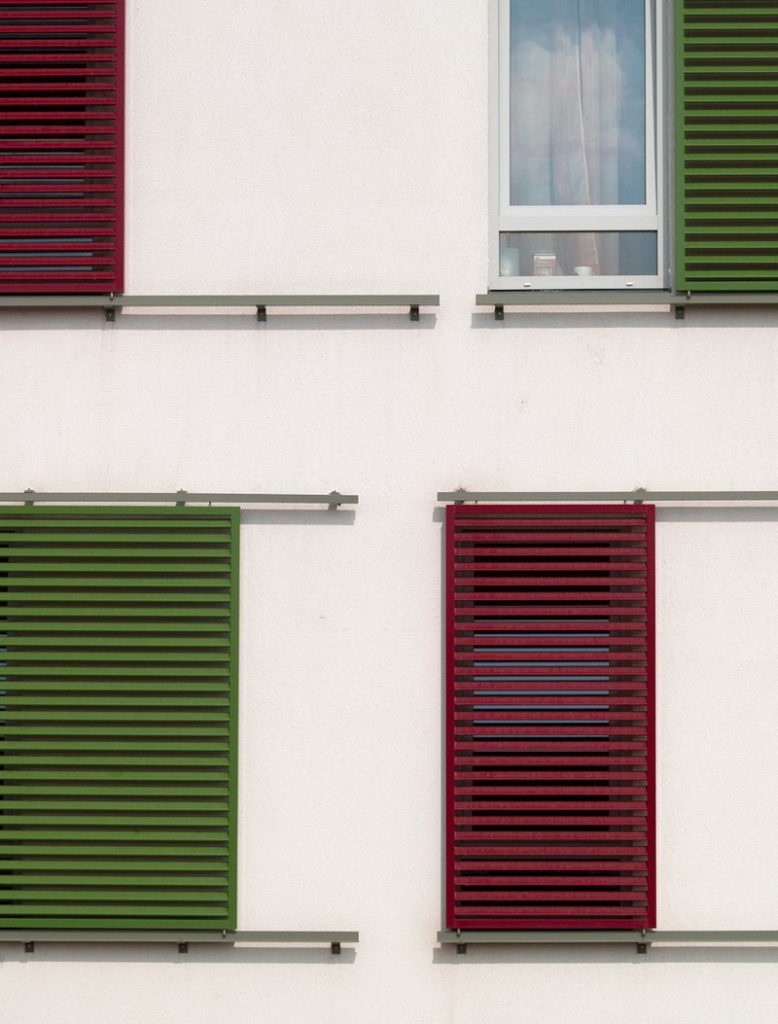 A szociális bérlakás-építészet nagy fegyelmet követel az építésztől. A szűk költségvetés azonban optimális esetben inspiráló is lehet, mint ahogy itt is történt. homlokzat architektúrája a lehető legpuritánabb. Fehérre vakolt falak, egyforma méretű nyílászárók. Az egyetlen elem, ami játékosságot, dinamizmust kölcsönöz a homlokzatnak, az a színes, eltolható alumínium árnyékoló panelek rendszere. A visszafogott háttér előtt maximálisan érvényesülnek a szerkezetben rejlő lehetőségek. A ház a ’kevesebb több’ elvének szép példája, örömünkre szolgál, hogy részesei lehettünk.
