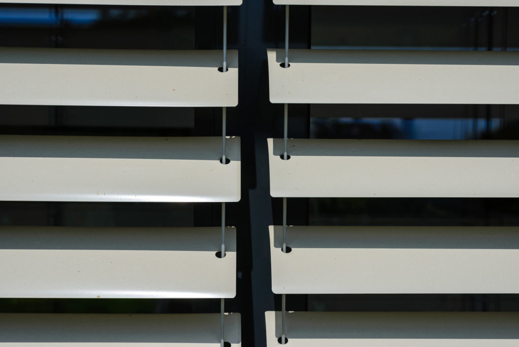 A pazar, zöld környezetben álló, dinamikus architektúrájú családi ház homlokzatán mészkő, fa és üveg felületek váltakoznak. A hatalmas üvegfelületek árnyékolását sodronyos megvezetésű, 100 mm széles, rugalmas elven működő, motoros mozgatású zsalúziák látják el.
